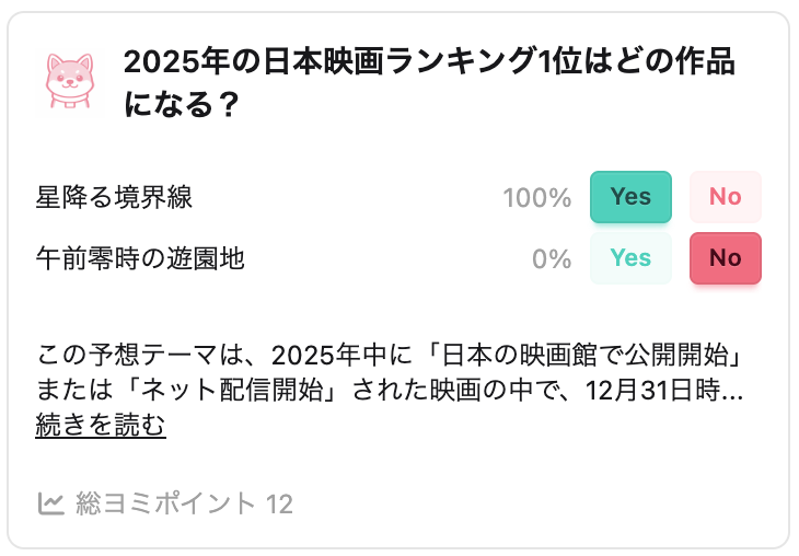 映画・アニメ・スポーツなど、ちょっと気になる予想テーマが並んでいます。正解を当てる必要はありません。今の直感でOKです。